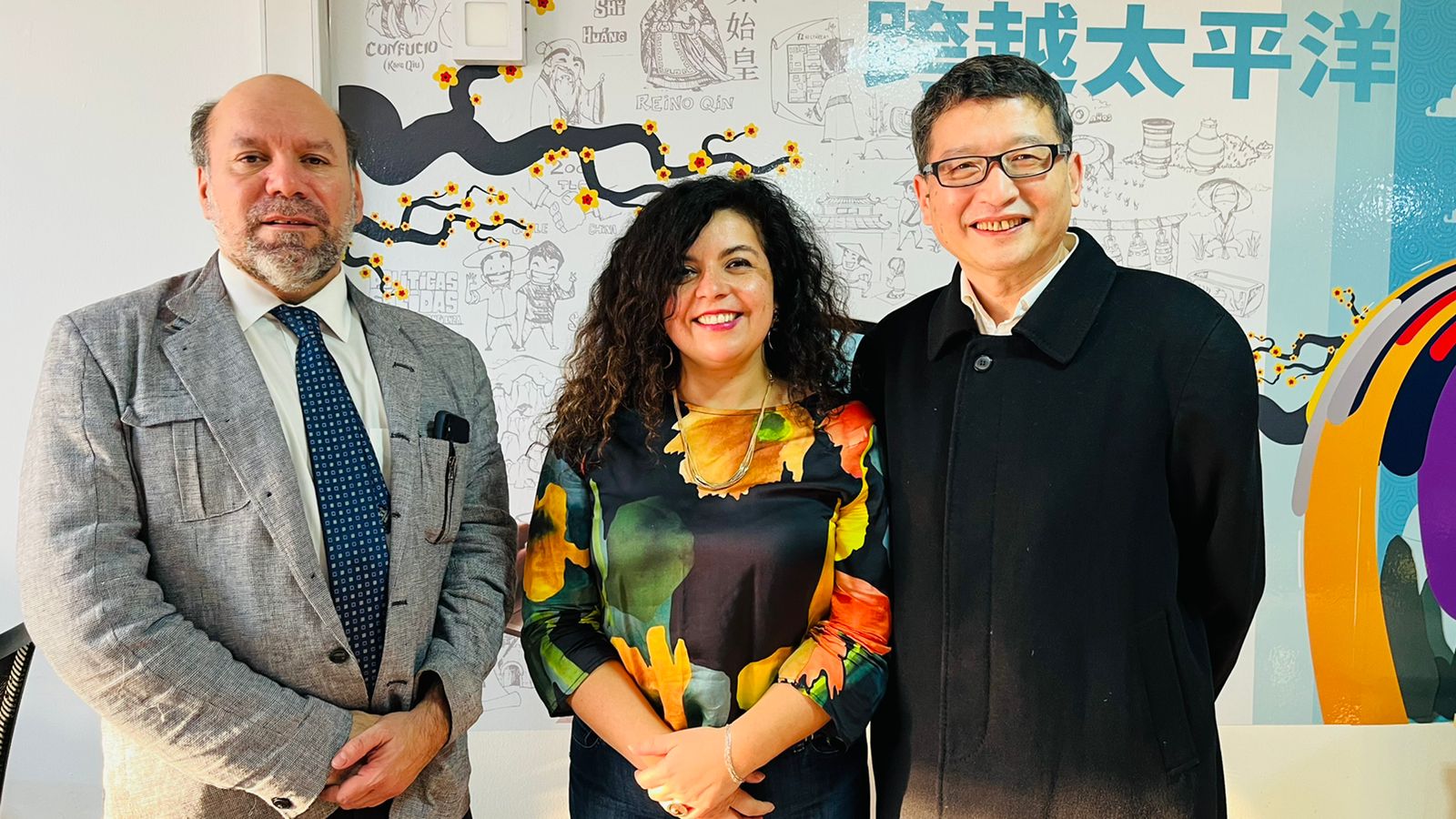 Este 8 de junio Rodrigo Fábrega Lacoa, Presidente de Cruzando el Pacífico y Karina Piña Pérez, Directora Ejecutiva de la Corporación se reunieron con el Sr. Cai Yunpeng, Primer Secretario y Agregado de Educación de la Embajada de la República Popular de China en Chile para conversar y analizar los nuevos proyectos a desarrollarse conjuntamente entre Cruzando el Pacífico y la Embajada los cuales seguirán permitiendo avanzar en programas de educación que acercan el aprendizaje del idioma y cultura a chilenos/as como a América Latina.